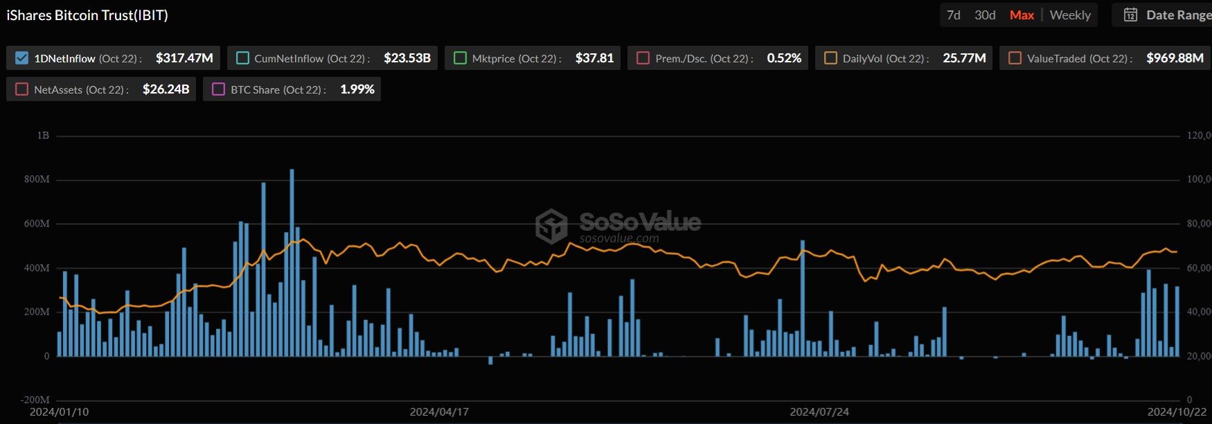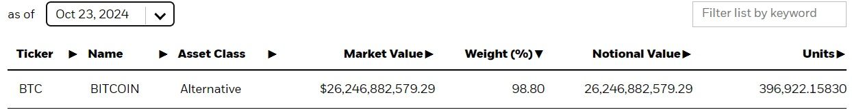 D’après le site internet de BlackRock, IBIT possède au 23 octobre 396 922 jetons BTC, pour une valorisation actuelle (67 320 $ par Bitcoin) de 26,25 milliards de dollars.