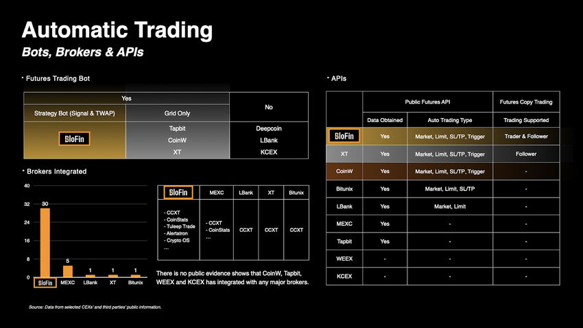 De plus, BloFin se trouve en tête de l’industrie avec 30 intégrations de courtiers, dépassant de loin les autres bourses. Parmi ses principaux partenaires, on trouve CCXT, CoinStats, Tuleep Trade, Alertatron et Crypto OS, offrant ainsi aux utilisateurs un accès inégalé aux outils et écosystèmes de trading externes. BloFin se distingue par des partenariats clairs et vérifiables avec les principales plateformes de courtage.