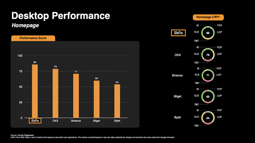 BloFin surpasse ainsi les principales bourses avec des performances de premier ordre pour sa page d’accueil, le trading au comptant et à terme. Selon les données des utilisateurs réels et les tests Google PageSpeed, la page d’accueil de BloFin a obtenu un score de 86, surpassant OKX (79), Binance (71), Bitget (60) et Bybit (54), offrant un chargement plus rapide, une interaction plus fluide et une première impression supérieure pour les utilisateurs.