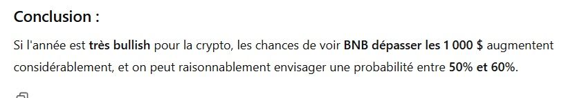 En parallèle, l’IA ChatGPT a également été interrogée sur la question et elle a elle aussi fait part de ses prédictions de prix. L’IA est certes moins optimiste que Coincodex mais tout de même, les prévisions restent plutôt positives. En effet, puisque ChatGPT estime actuellement, d’après les dernières évolutions du marché crypto, que le BNB a 50-60 % de probabilités d’atteindre un prix supérieur à 1 000 $ au cours de l’année.