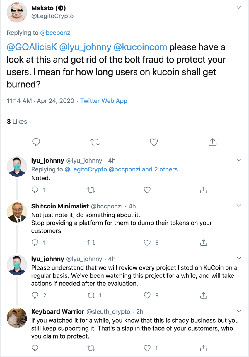 Le PDG de Kucoin a depuis répondu et assure que le problème est en révision. Il est possible que l’entreprise choisisse de retirer le token de sa liste.