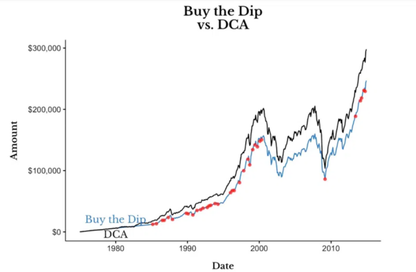 “Buy the Dip” signifie acheter chaque fois que le prix baisse. Il s’agit des points rouges sur la ligne bleue.