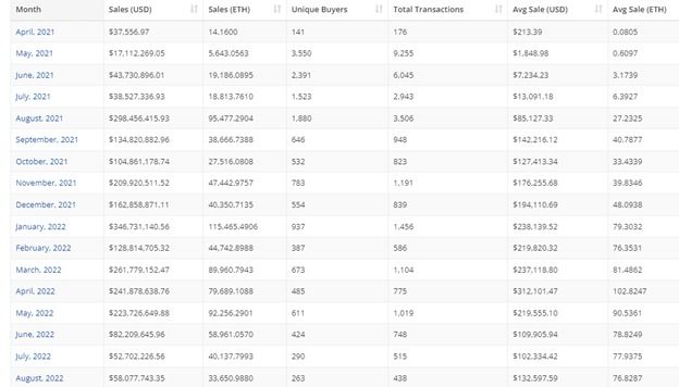 Sponsored SponsoredLa nouvelle baisse du nombre d’acheteurs uniques à 290 en juillet puis à 263 en août a fait chuter les ventes en dessous de 60 millions de dollars au cours des deux derniers mois. En août 2022, le volume des ventes ne dépassait pas les 58 millions de dollars.