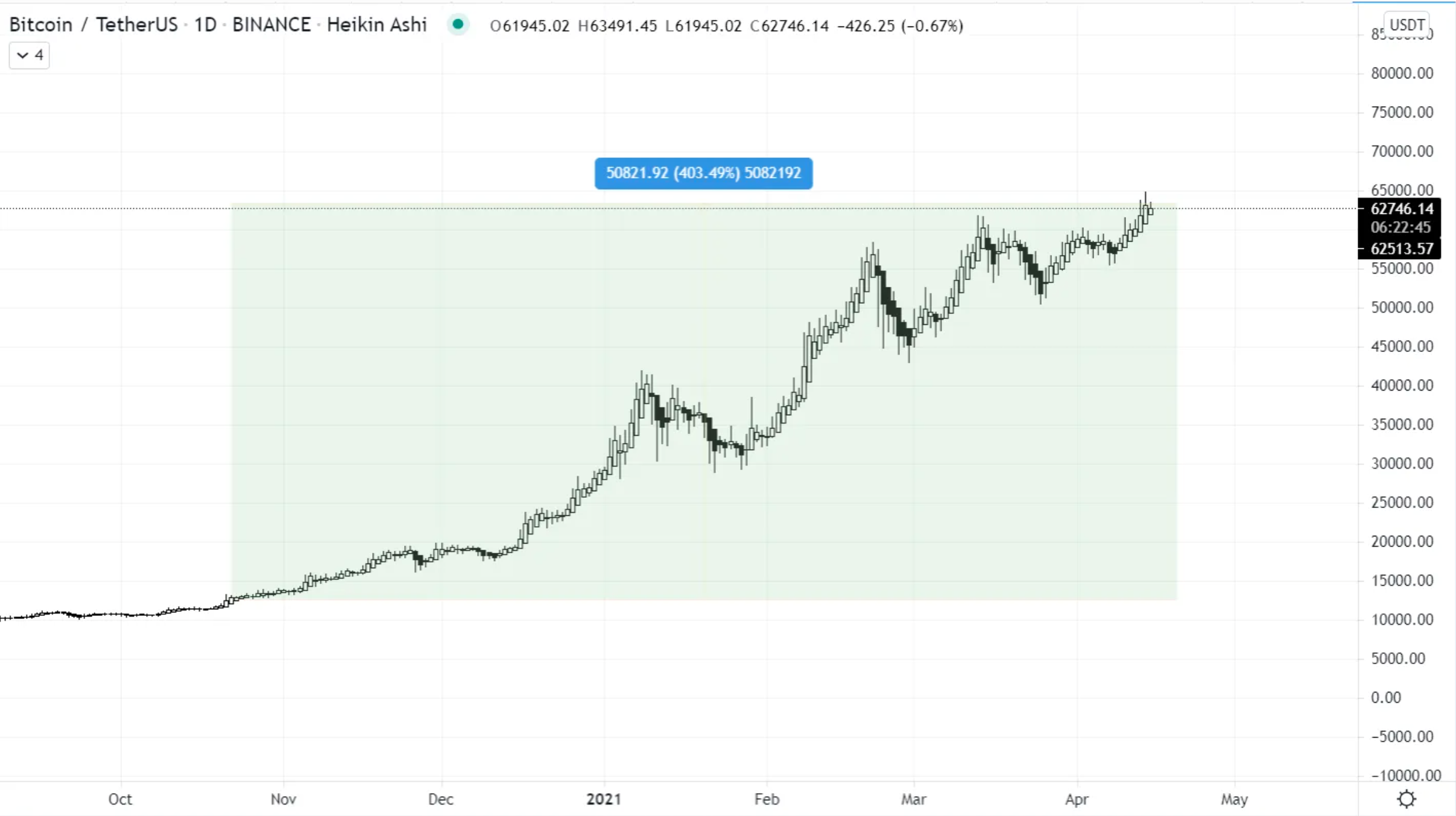 Le Bitcoin a connu un gain de prix impressionnant de 400% depuis le début de la vente, passant de 12500 $ à son récent sommet de 64800 $.