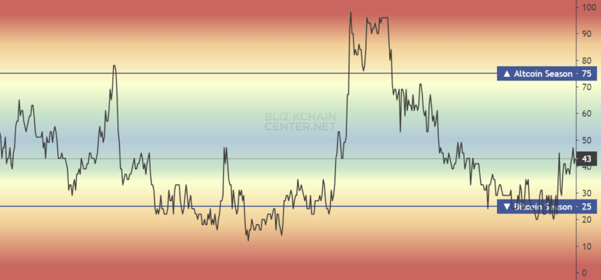 Actuellement, l’indice est revenu dans la zone neutre et affiche une lecture de 43. S’il subit un rejet de cette zone (ce qui a déjà été le cas en mai 2022), la Bitcoin Season se poursuivra. Si, en revanche, il poursuit sa trajectoire ascendante, on peut s’attendre à un retournement. La tant attendue saison des altcoins prendrait place !