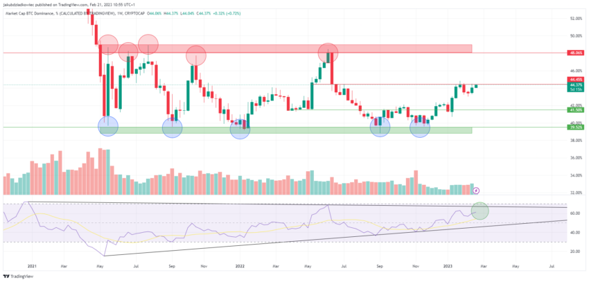 Depuis, la domination de Bitcoin a trouvé une résistance au sein de la fourchette de 48-49 % (cercles rouges). En même temps, elle a trouvé un support dans la fourchette de 38,50-39,50 % (cercles bleus). Entre-temps, deux autres niveaux clés sont apparus en 2022 : le support situé à 41,50 % et la résistance à 44,50 %. Cette dernière a été atteinte récemment en raison de la hausse rapide du BTC depuis le début de 2023.