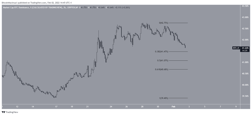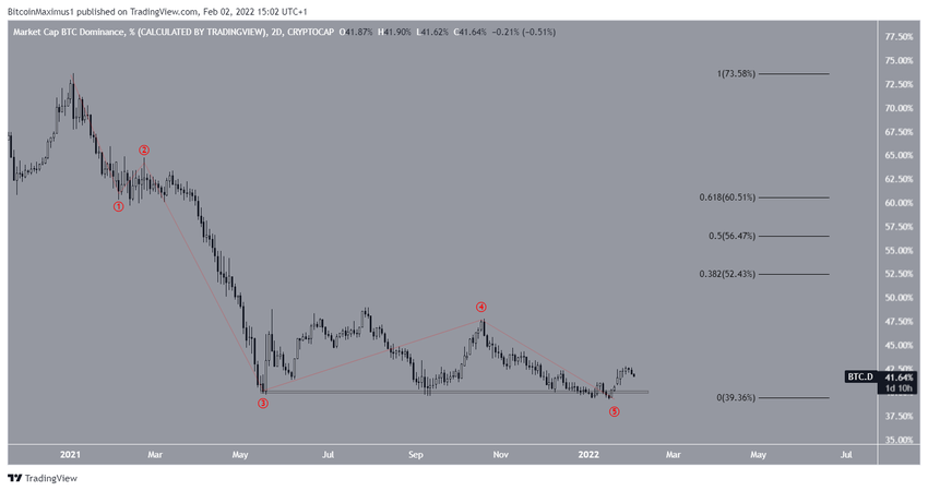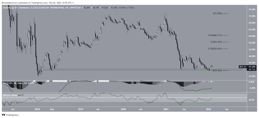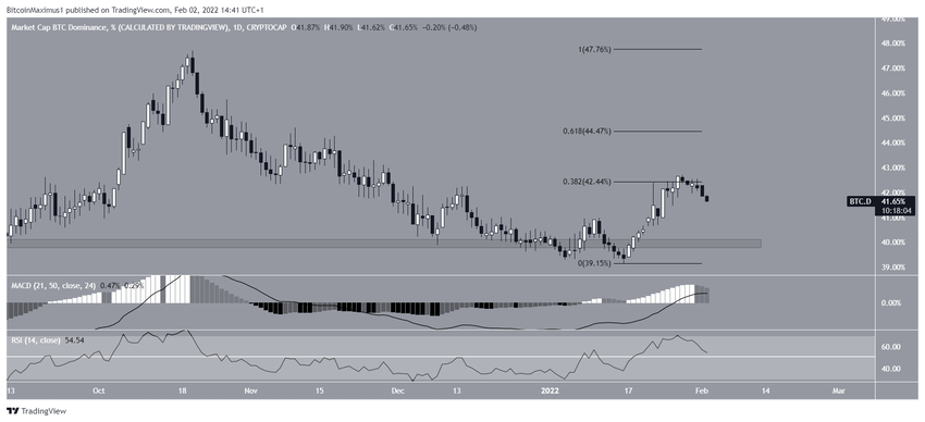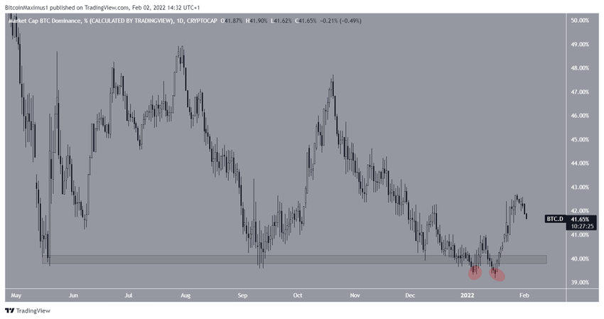 Le BTCD évoluait au-dessus de la zone de support horizontale de 40% depuis mai 2021. Cette zone a été le catalyseur de plusieurs mouvements haussiers.