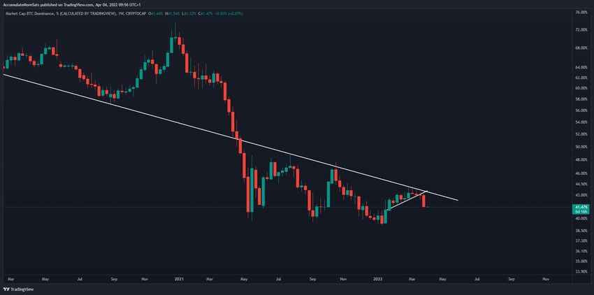 La semaine du 28 mars au 4 avril, le taux de domination de Bitcoin (BTCD) a décliné abruptement et se dirige maintenant vers son plancher annuel.