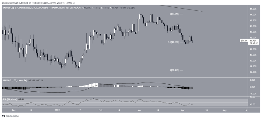 Bien que le BTCD ait rebondi à la zone de support du retracement de Fibonacci 0,5 situé à 41,60%, le RSI comme la MACD sont en déclin. De plus, le RSI est inférieur à 50, tandis que la MACD est négative. Ces deux éléments sont considérés comme des signes d’une tendance baissière.