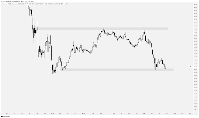 Le taux de domination de Bitcoin (BTCD) a créé un schéma de double creux au niveau du support de long terme situé à 39,5 %.