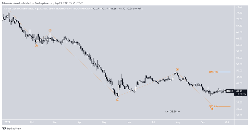 Le décompte de vague le plus plausible suggère que le BTCD se trouve dans la cinquième et dernière vague d’une impulsion baissière (en orange).