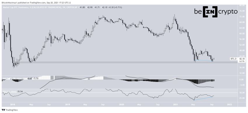 Le taux de domination de Bitcoin (BTCD) a créé un schéma de double creux de long terme, lequel est proche de la zone de support de long terme des 39,50%.