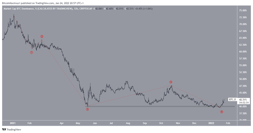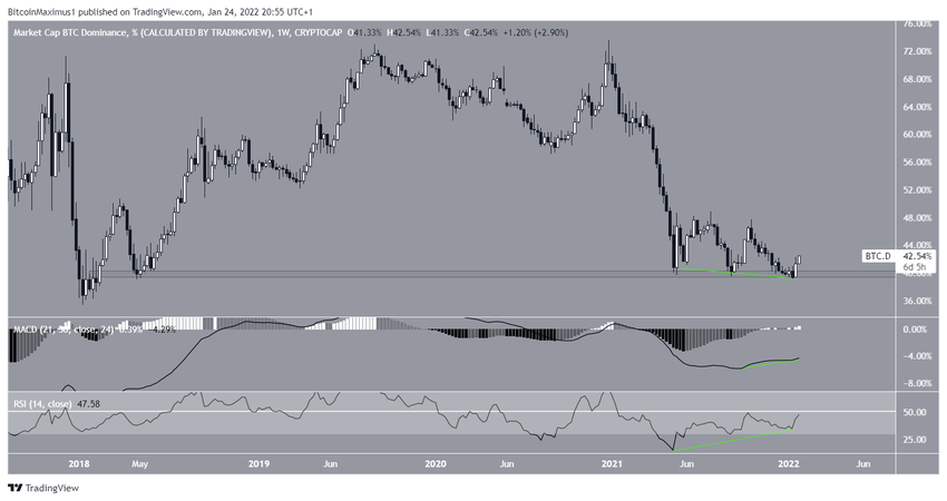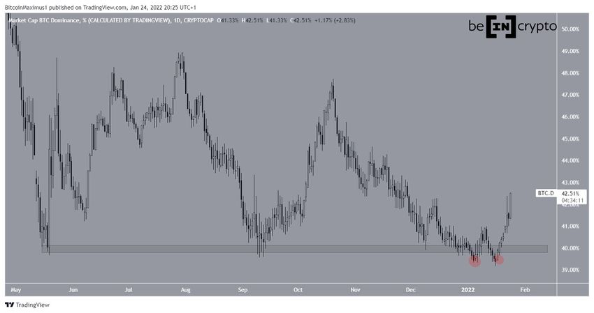 Au début de l’année 2022, le BTCD a légèrement dévié sous cette zone de support à deux reprises (cercles rouges), avant de la regagner le 21 janvier.