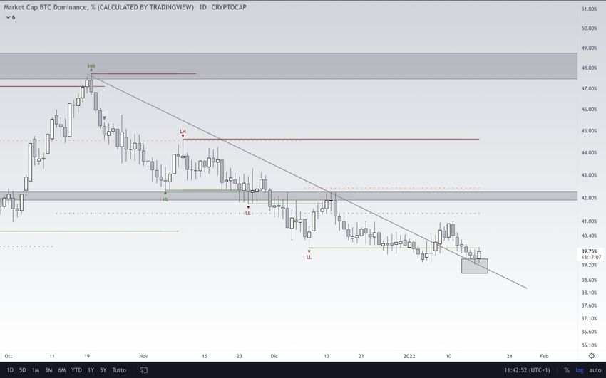 Depuis le 18 mai 2021, le taux de domination de Bitcoin évolue au-dessus de la zone de support horizontal des 40%. Depuis, cette zone a soutenu le BTCD à de multiples reprises. Un rebond à ce support a notamment mené à un sommet local de 47,7% atteint le 20 octobre 2021, mais le cours a rechuté immédiatement après.