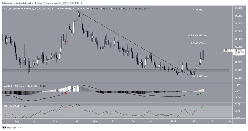 Le BTCD s’approche maintenant de la résistance du retracement de Fibonacci 0,5-0,618, située entre 43,5% et 44,5%.