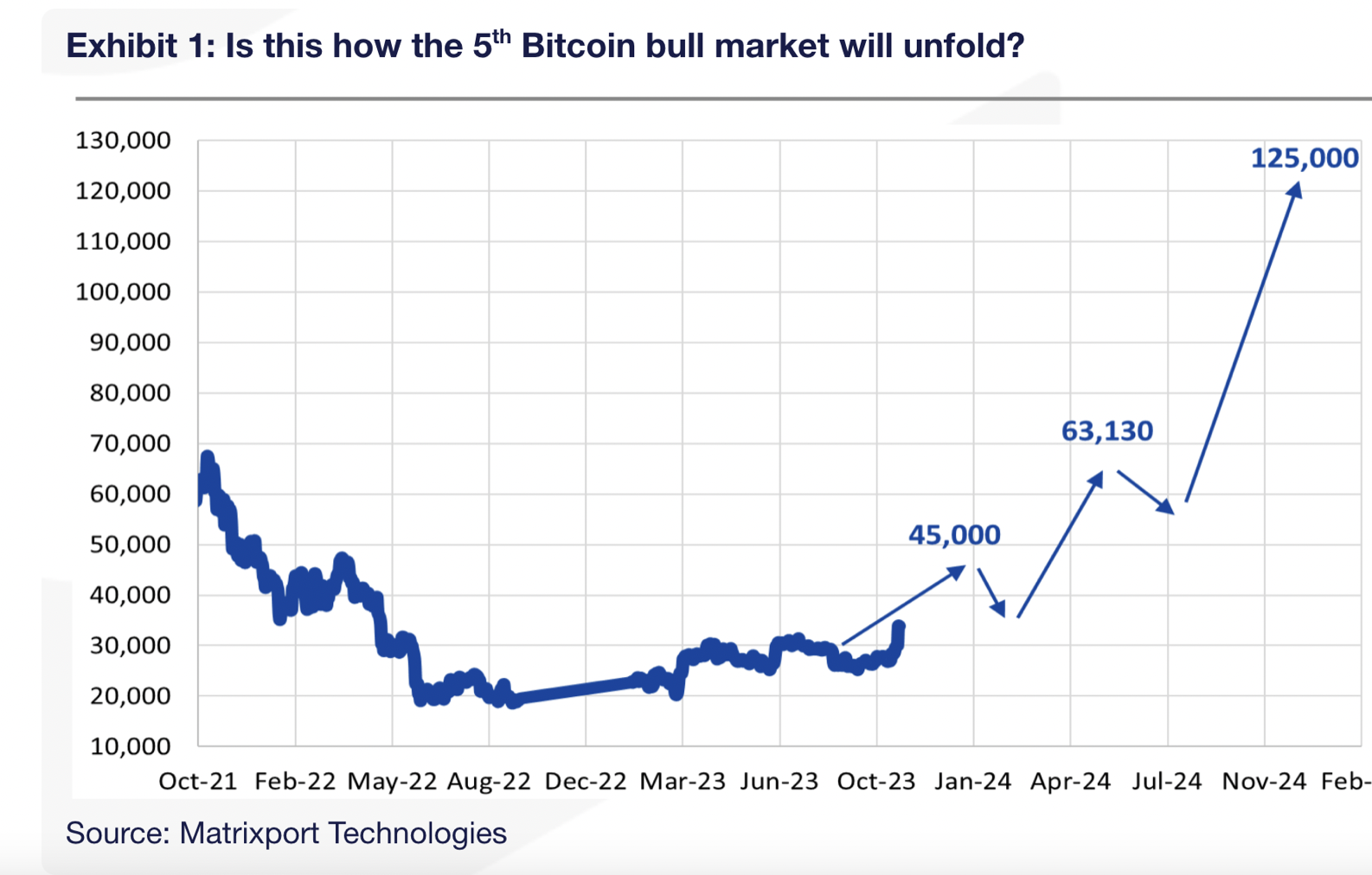 Le cinquième bull market du Bitcoin serait déjà en place d’après ce qu’a révélé Matrixport. Selon les estimations de la firme de recherche, le cours du BTC pourrait atteindre 125 000 $ d’ici décembre 2023.