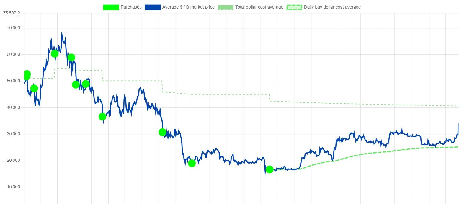 Si l’on prend en compte le cours actuel du BTC, une évolution depuis les 33 800 $ jusqu’au 100 000 $ représenterait une hausse de 195,86 %. Cela permettrait même de plus que doubler le capital actuel.