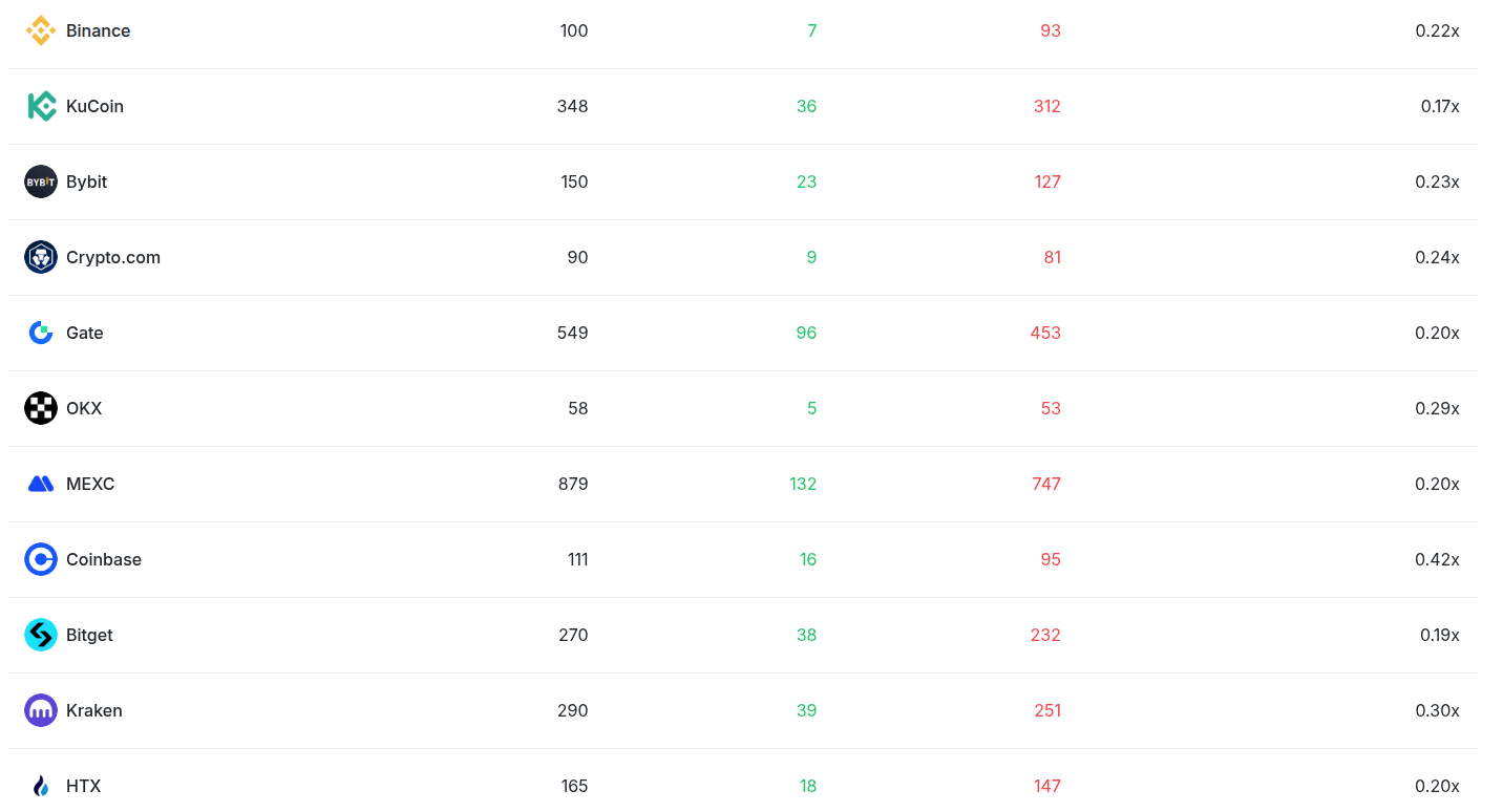 Selon CryptoRank, sur les 100 tokens listés sur Binance en 2025, 93 ont terminé dans le rouge, avec un rendement médian (ROI) de seulement 0,22x. Bybit et MEXC ont affiché des résultats similaires, avec des ROIs médians respectifs de 0,23x et 0,21x.