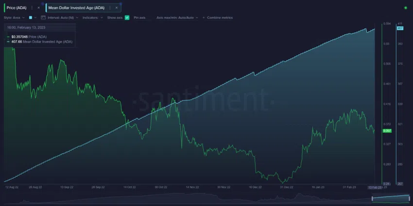 L’indicateur de l’âge moyen des investissements en dollars (Mean Dollar Invested Age) de Santiment indique que les gros investissements du token Cardano restent dormants, le temps moyen pendant lequel les pièces demeurent dans une adresse étant passé de 267 jours à 407 jours au cours des six derniers mois. Ce manque de circulation s’avère préoccupant pour l’actif.