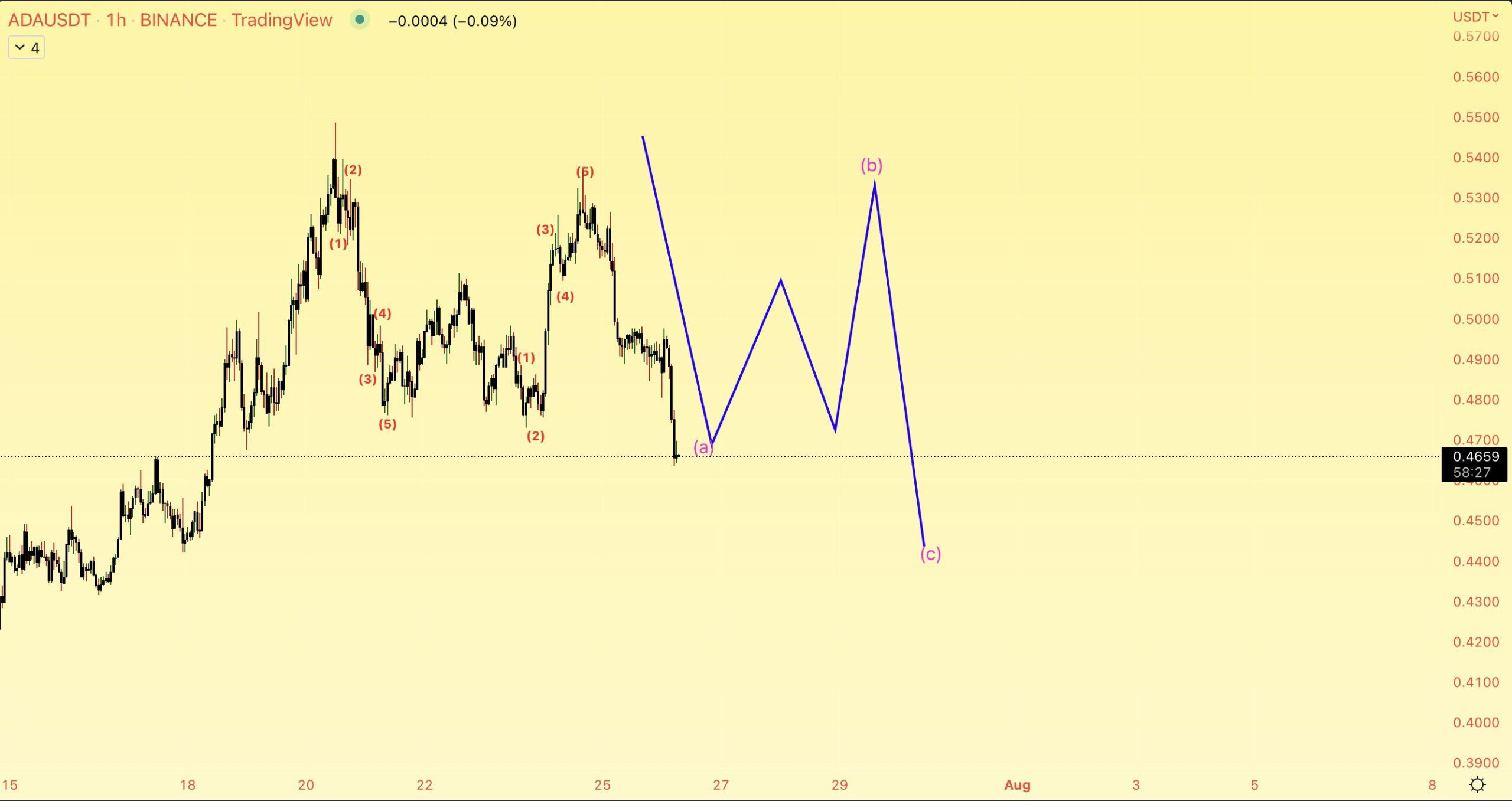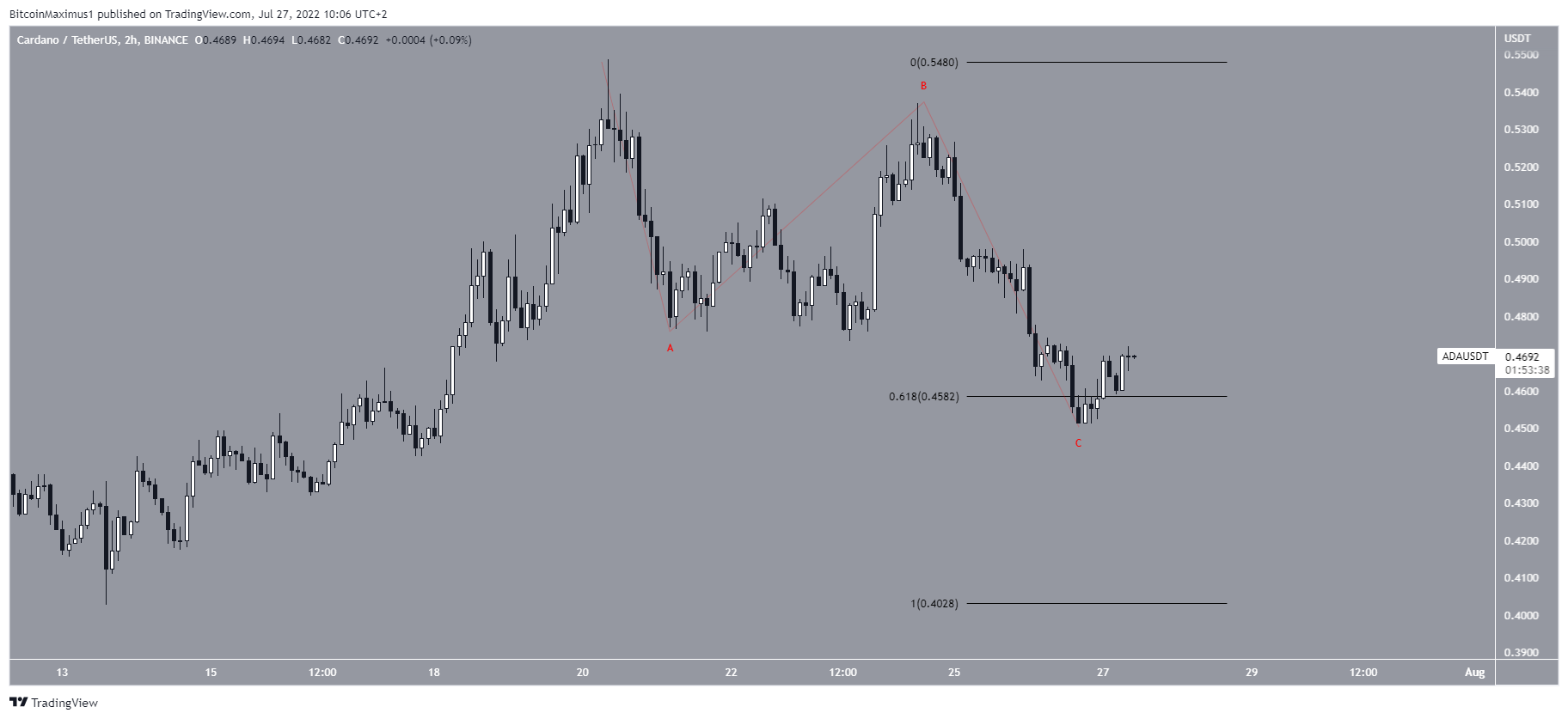 Depuis le tweet, l’ADA a déjà atteint cet objectif. L’ensemble de sa baisse ressemble à un modèle correctif en A-B-C (en noir). Ce modèle a conduit à un déclin sous le niveau de retracement de Fibonacci 0,618, mais le cours a depuis récupéré cette zone.