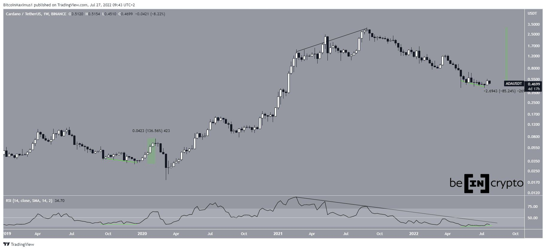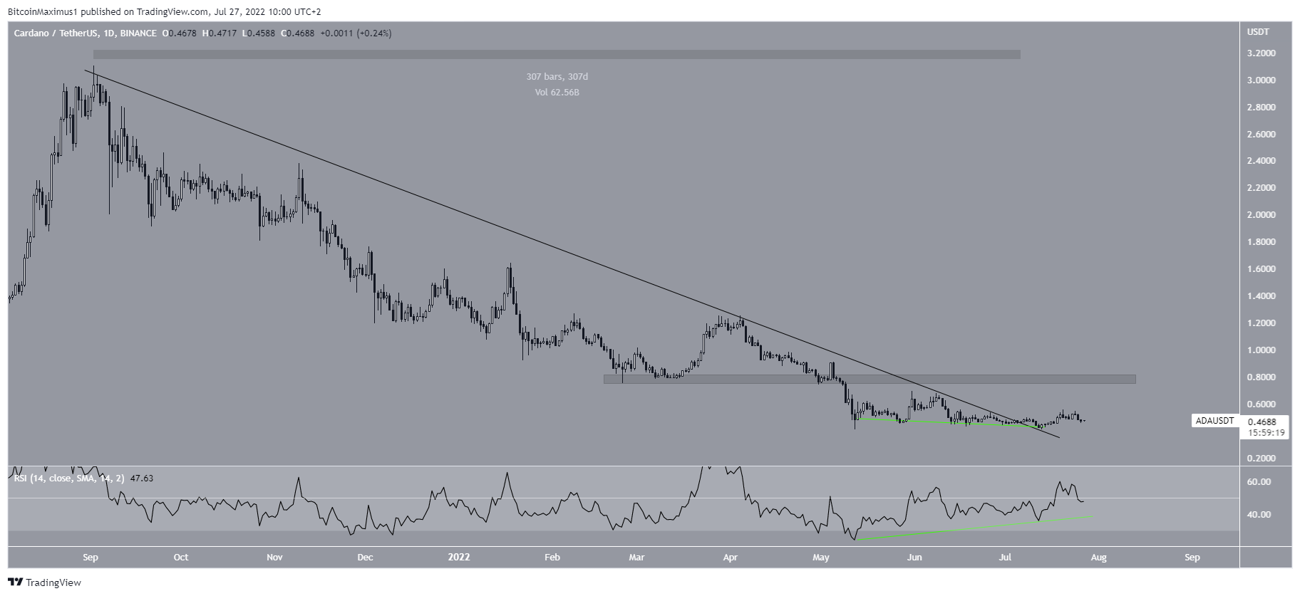 Cardano (ADA) a dépassé une ligne de résistance descendante de 307 jours après que le RSI journalier comme hebdomadaire ait généré des divergences haussières.