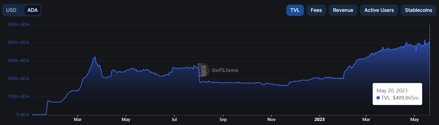 Bien que la valeur totale bloquée (TVL) soit retombée à 409,86 millions de pièces à l’heure où nous rédigeons cet article, cette hausse suggère que l’écosystème DeFi de Cardano est en plein essor.