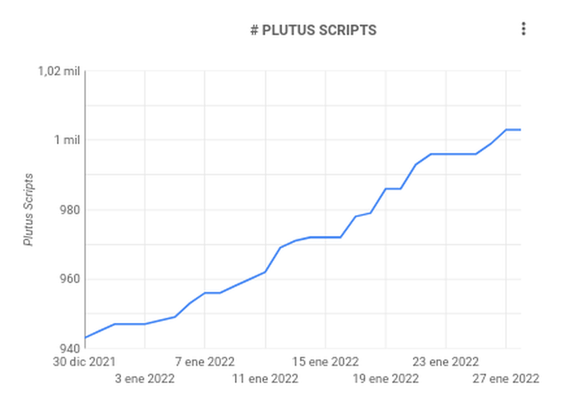 SponsoredLe nombre de contrats intelligents sur le réseau Cardano a augmenté rapidement depuis le 26 décembre, date à laquelle il s’élevait à 936 contrats intelligents, selon les données de Plutus. À partir de là, la courbe a grimpé jusqu’à atteindre un sommet ce 28 janvier, avec un record historique de 1 003 contrats intelligents.