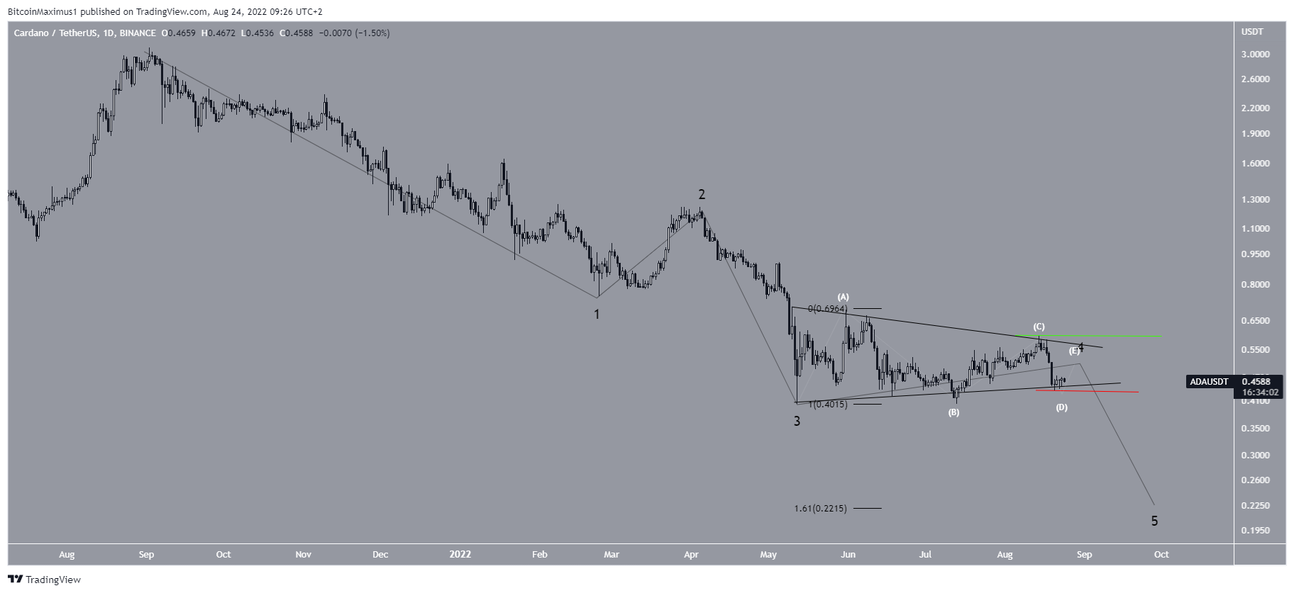 Le crypto trader @CryptoCapo a partagé sur Twitter un graphique de l’ADA, affirmant que le cours complétera bientôt un mouvement de déclin en cinq vagues.