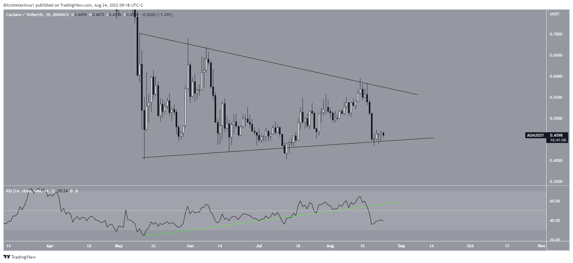 Le graphique quotidien montre que Cardano s’échange au sein d’un triangle symétrique depuis le bottom 12 mai. Ce genre de triangle contient généralement des figures neutres, ce qui signifie que le cours pourrait soit dépasser ce triangle, soit passer en-dessous.