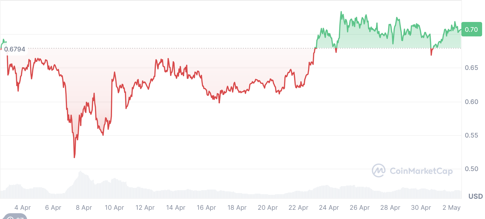 Comme la majorité des autres cryptomonnaies, le cours d’ADA a connu un début compliqué d’avril avec la croisade tarifaire de Trump mais, a rebondi après les reculades en série du locataire de la Maison Blanche. Entre le 9 avril jusqu’au moment d’écrire cet article, la valeur du token de Cardano est passée de 0,60 $ à 0,7084 $ ; soit donc une hausse de 18 %. Cependant, comparé au pic du token sur un an survenu fin janvier à 1,20 $, le cours d’ADA a encore du chemin à parcourir.