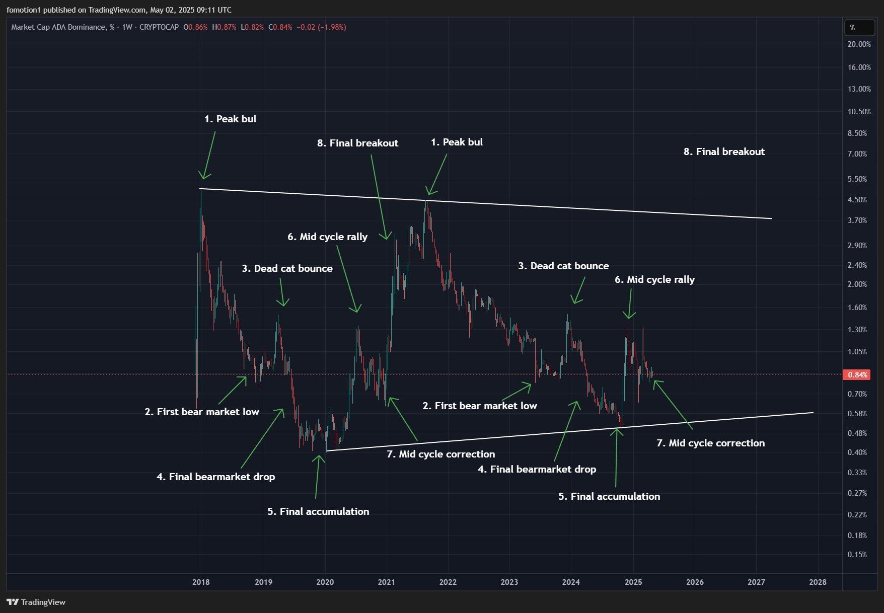 Et ce n’est pas fini. Le graphique de dominance posté par @Fomotion1 montre que le comportement d’ADA suit de très près son cycle 2019–2021. Même patterns, même creux, même moments de relance. Pour ceux qui aiment les fractales, ce genre de configuration est un rêve. Si l’histoire se répète, on serait juste avant le “final breakout”. À surveiller de très près.