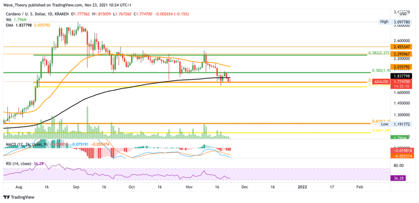 Le cours de Cardano est en phase de correction depuis quelques semaines, et il se trouve maintenant au niveau du support du golden ratio, situé à environ 1,75 dollars.