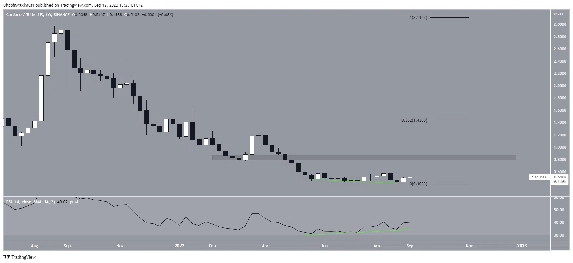 Le graphique hebdomadaire de la crypto ADA montre un potentiel pour des hausses futures. Cela est principalement dû au potentiel schéma de double ou triple creux, en cours de développement depuis juin. Ce schéma s’est combiné à des divergences haussières au sein du RSI hebdomadaire (ligne verte). Ce genre de divergence sert souvent de catalyseur pour de considérables mouvements de hausse.