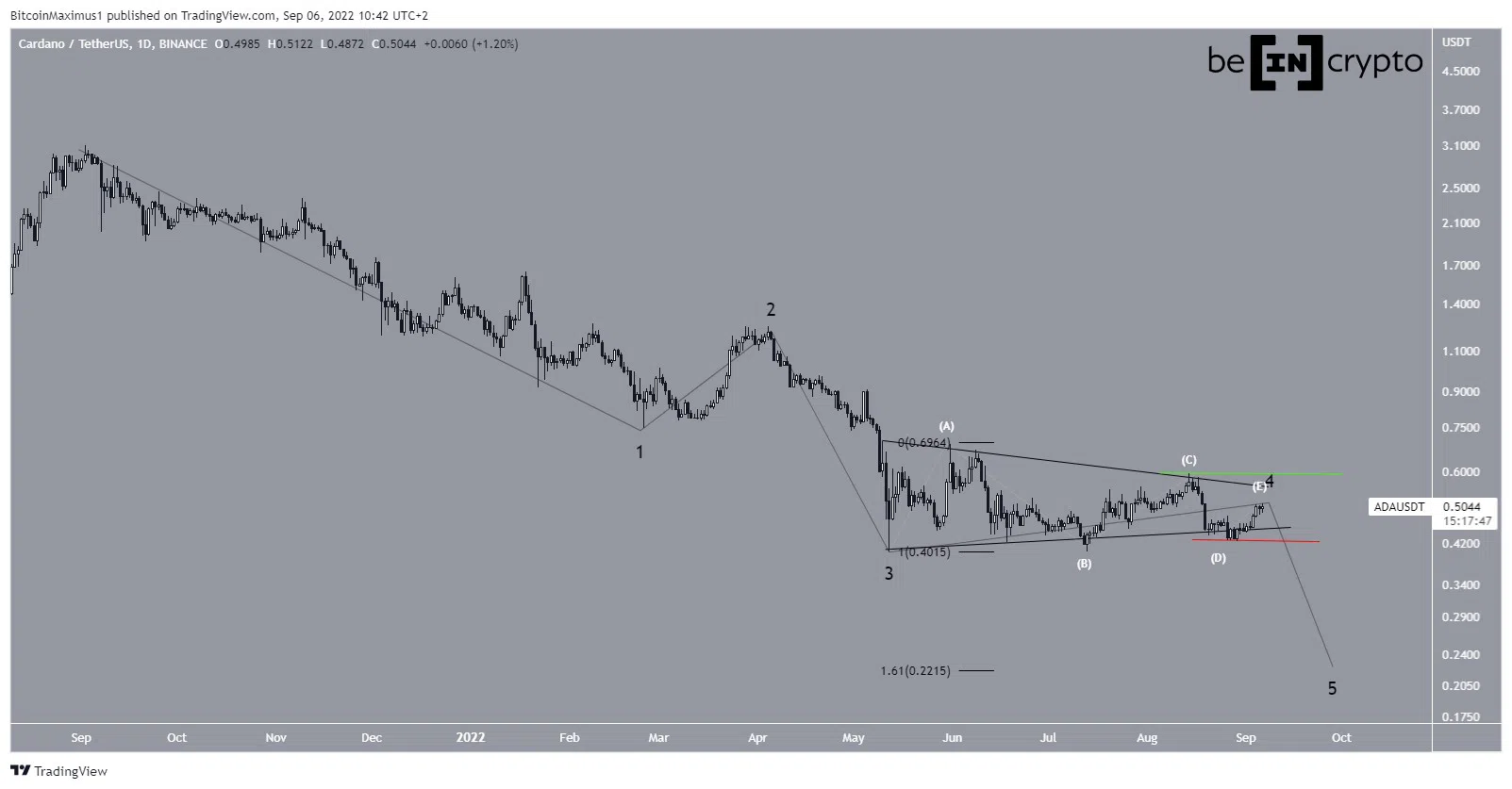 Cependant, le décompte de vagues sème le doute quant à cette hypothèse. En mesurant le mouvement depuis son sommet record, il semble que le cours de l’ADA soit en passe de compléter un mouvement baissier en cinq vagues (en noir).