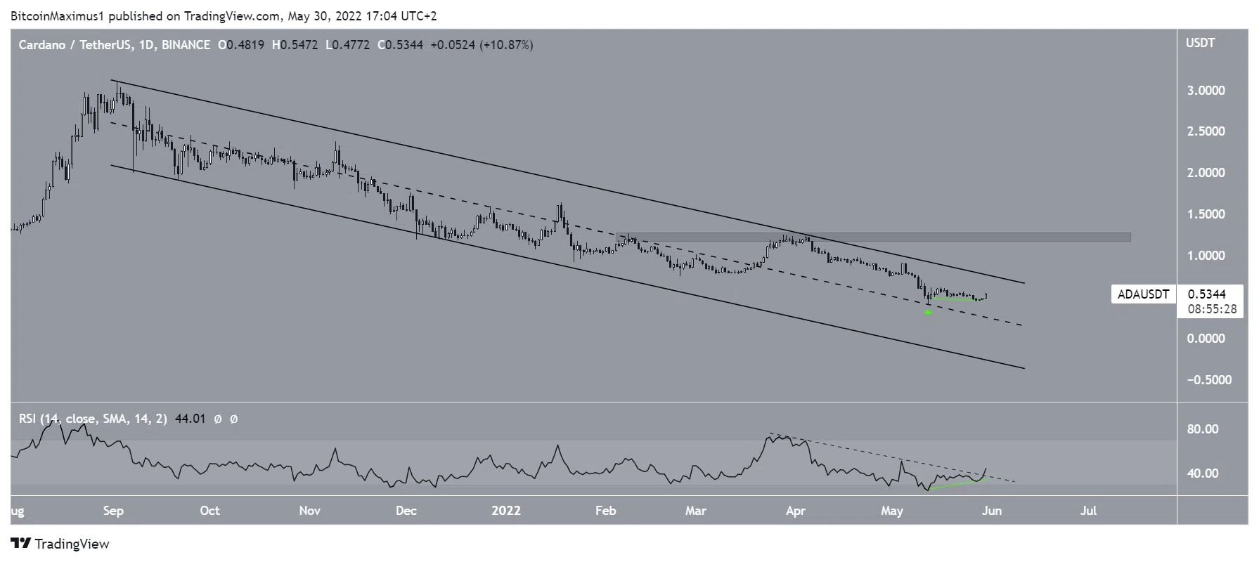 Après avoir atteint un nouveau creux le 12 mai, Cardano (ADA) a rebondi. Il est possible que cette hausse du cours d’ADA provoque une cassure du canal parallèle descendant à long terme.