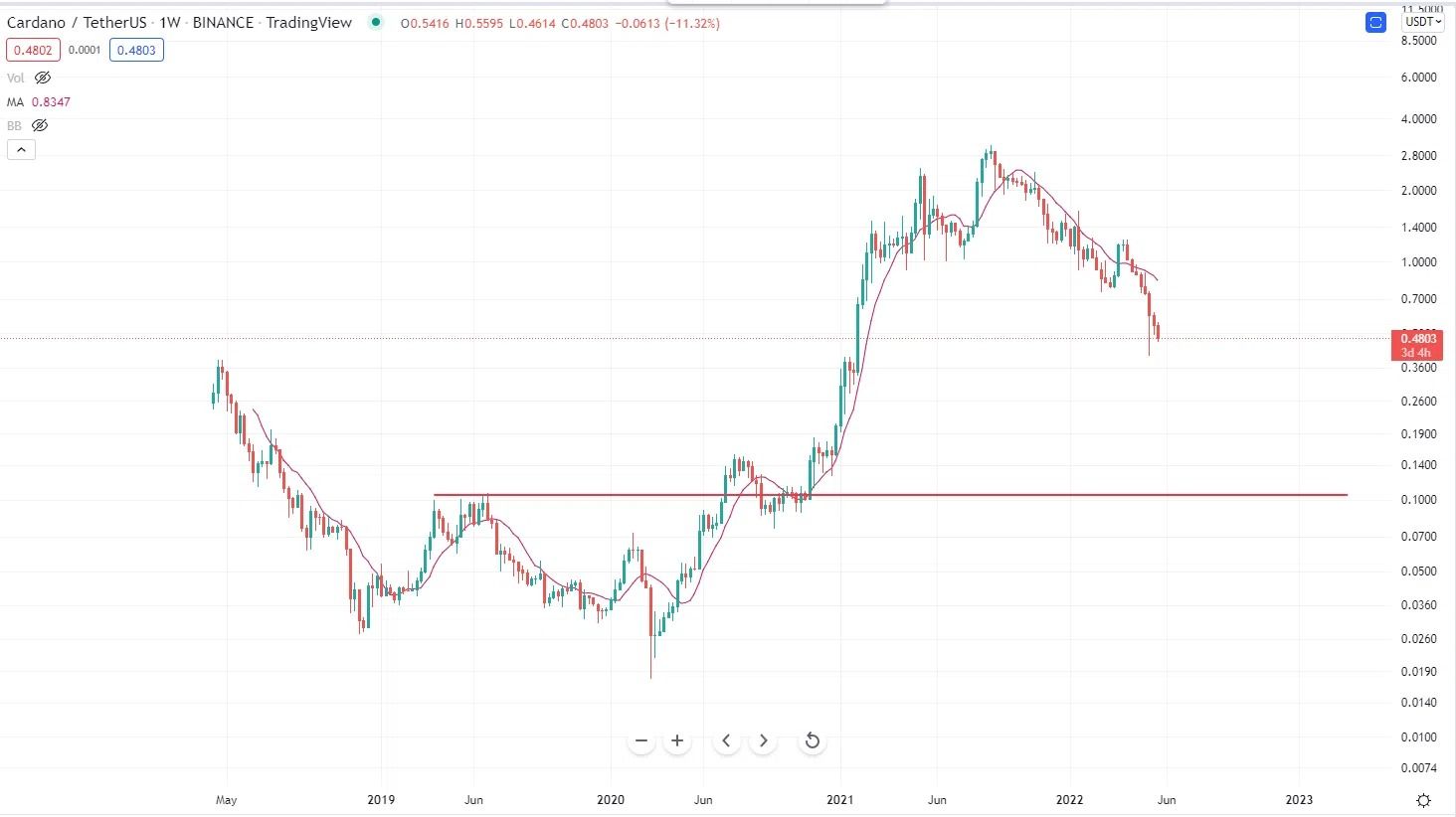 Après avoir atteint un sommet historique de 3,10 $ le 2 septembre 2021, ADA a perdu près de 90% de sa valeur. Ce mouvement baissier a provoqué la cassure d’une ligne de support ascendante qui était en place depuis mars 2020, chose qui l’a fait chuter à 0,40 $ le 12 mai.