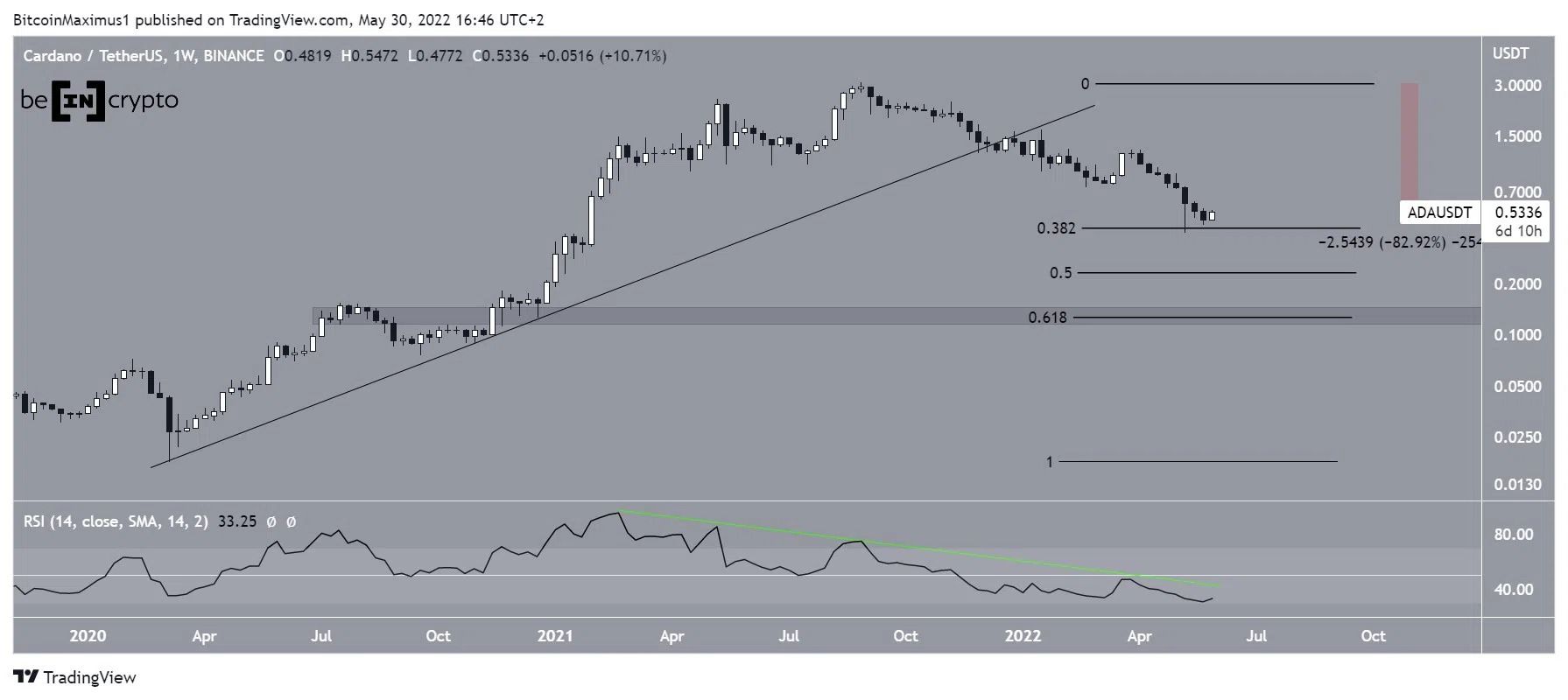 Ce mouvement baissier a été précédé d’une divergence baissière considérable du RSI hebdomadaire (ligne verte). Jusqu’à présent, la ligne de tendance de la divergence est toujours intacte. Un passage au-dessus de cette ligne serait nécessaire pour envisager la possibilité d’un renversement de la tendance haussière. De plus, le RSI hebdomadaire d’ADA a atteint un plancher de 31, sa valeur la plus basse depuis décembre 2018.