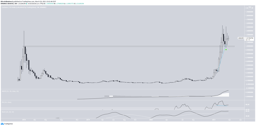 Le 27 février, l’ADA a atteint un nouveau sommet historique de 1,54$. Il a chuté presque immédiatement après, mais cela a permis de valider le niveau de son ancien sommet record, à 1$, en tant que support (flèche verte). Depuis, le cours du token est en hausse.