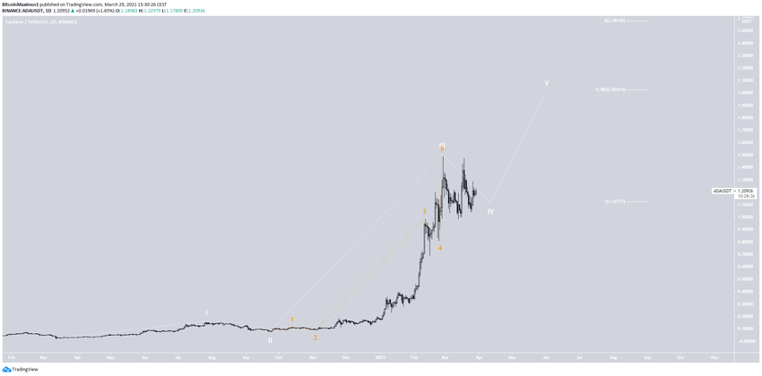 Dans le décompte de vagues le plus plausible pour l’ADA, le token se trouve dans la vague quatre (en blanc) d’une impulsion haussière démarrée en mars 2020.