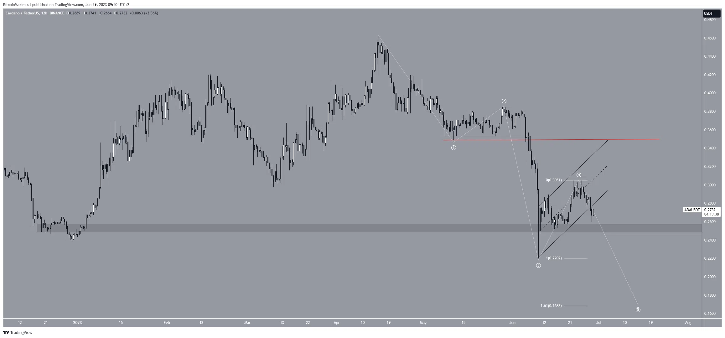 Une analyse plus poussée du décompte de vagues de Cardano offre une perspective baissière, suggérant que le cours finira par passer sous le support horizontal de 0,25 $. Les analystes utilisent la théorie des vagues d’Elliott pour identifier les schémas récurrents de long terme et la psychologie des investisseurs, ce afin de déteriner la direction d’une tendance.
