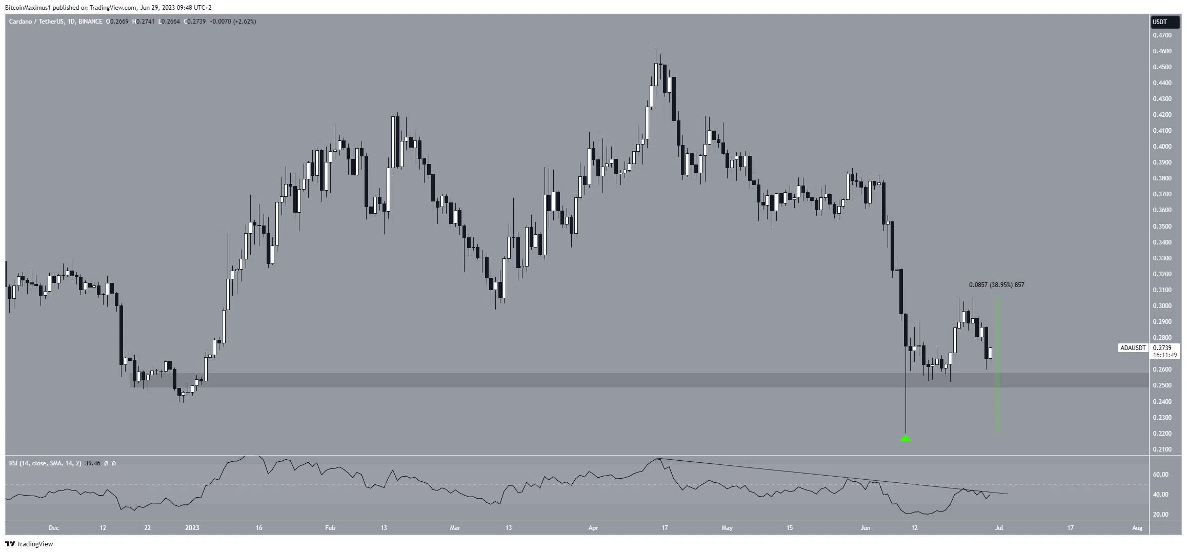 L’analyse technique des données sur la journée nous montre que le cours de l’ADA a rebondi de 39 % entre le 10 et le 25 juin. Ce rebond a démarré lorsque l’actif a chuté à son nouveau plancher annuel, ce le 10 juin, et le cours a ensuite regagné le support horizontal des 0,25 $.
