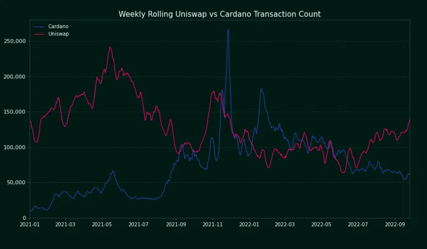 En comparant les transactions par seconde sur Cardano par rapport à Uniswap, Evan Van Ness a souligné que Cardano compte moins d’une transaction par seconde, ce qui est nettement inférieur à Uniswap.