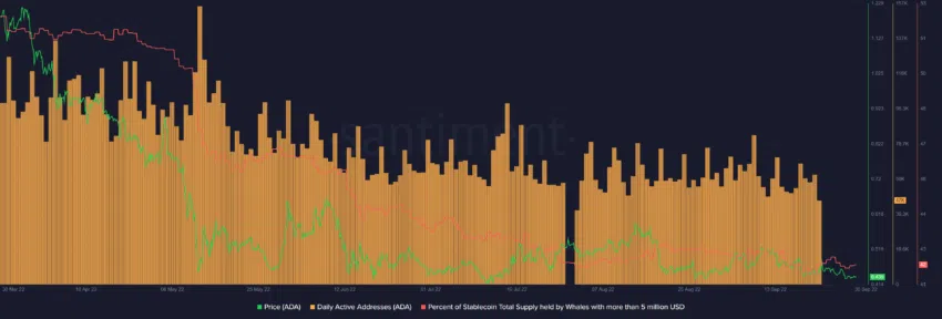 Cependant, avec le pourcentage de l’offre totale de stablecoins détenu par les baleines Cardano disposant au moins de plus de 5 millions de dollars, il était évident que ces “whales” notaient une baisse de confiance. Ainsi, celles-ci on affiché un déclin continu.