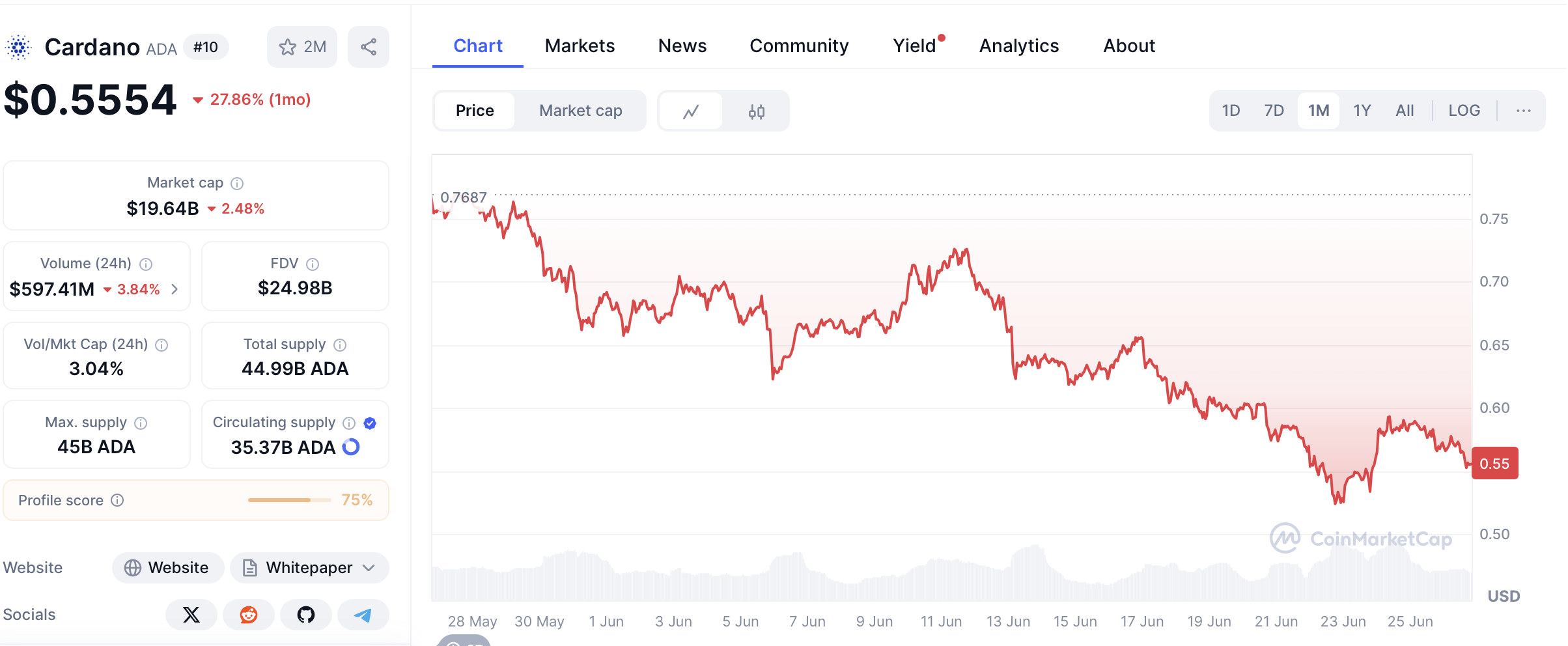 ADA évolue actuellement autour des 0,5530 $, en baisse de 2,64 % sur les dernières 24h. Sur le mois de juin, la perte dépasse déjà les 28 %. Pas besoin de faire un dessin : la dynamique est clairement baissière pour la crypto, et le seuil des 0,50 $ devient critique. En dessous, il n’y a pas grand-chose pour amortir la chute avant la zone des 0,42–0,45 $.