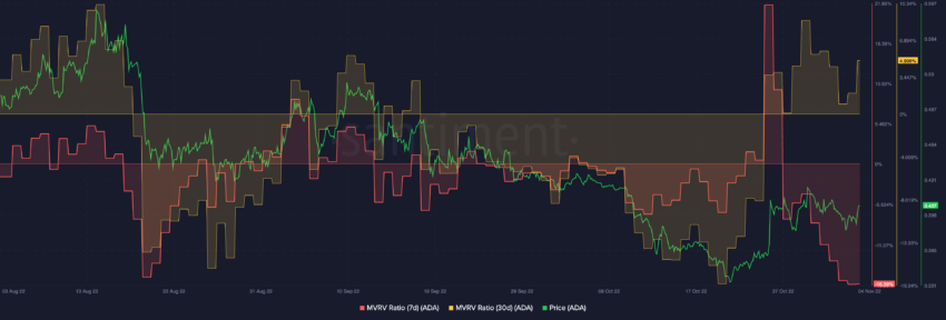 Le ratio de l’indicateur MVRV sur 7 jours d’ADA indique que l’actif était largement sous-évalué à son cours actuel. En effet, l’indicateur était à son niveau le plus bas depuis 3 mois.
