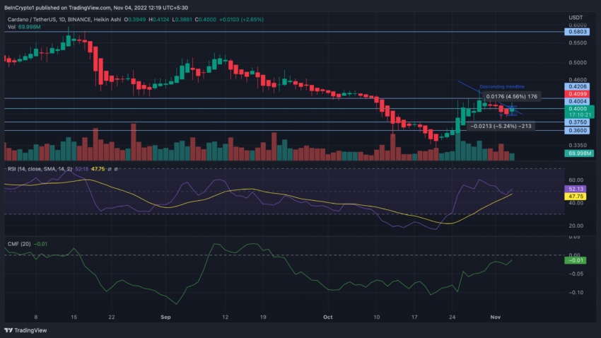 Le récent gain de 4 % du cours ADA a inversé les pertes du 2 novembre, lesquelles avaient fait chuter la pièce de plus de 5 %. Cardano a commencé ce jour-là à un creux de 0,384 $, mais les bulls parviennent à le maintenir au-dessus du support clé au niveau de 0,375 $ depuis plus de 10 jours maintenant.