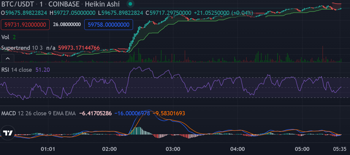 SponsoredLes indicateurs techniques pour cette journée sont cette fois-ci négatif. La MACD est négative et le RSI affiche une lecture à 51. Les deux cibles les plus probables pour le prochain sommet se situent entre 59 700 $ et 60 000 $, ainsi que 63 250 $ et 63 850 $.