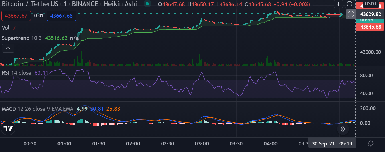 Le cours de la crypto BTC a présenté pour cette journée du 30 septembre une ascension fulgurante instable. De son point le plus bas la journée précédente, situé à 40 961 $, il est passé à 43 643 $. Cela pourrait paraître bénin, mais en se penchant sur la plage de temps de la semaine, sa croissance en devient apparente.