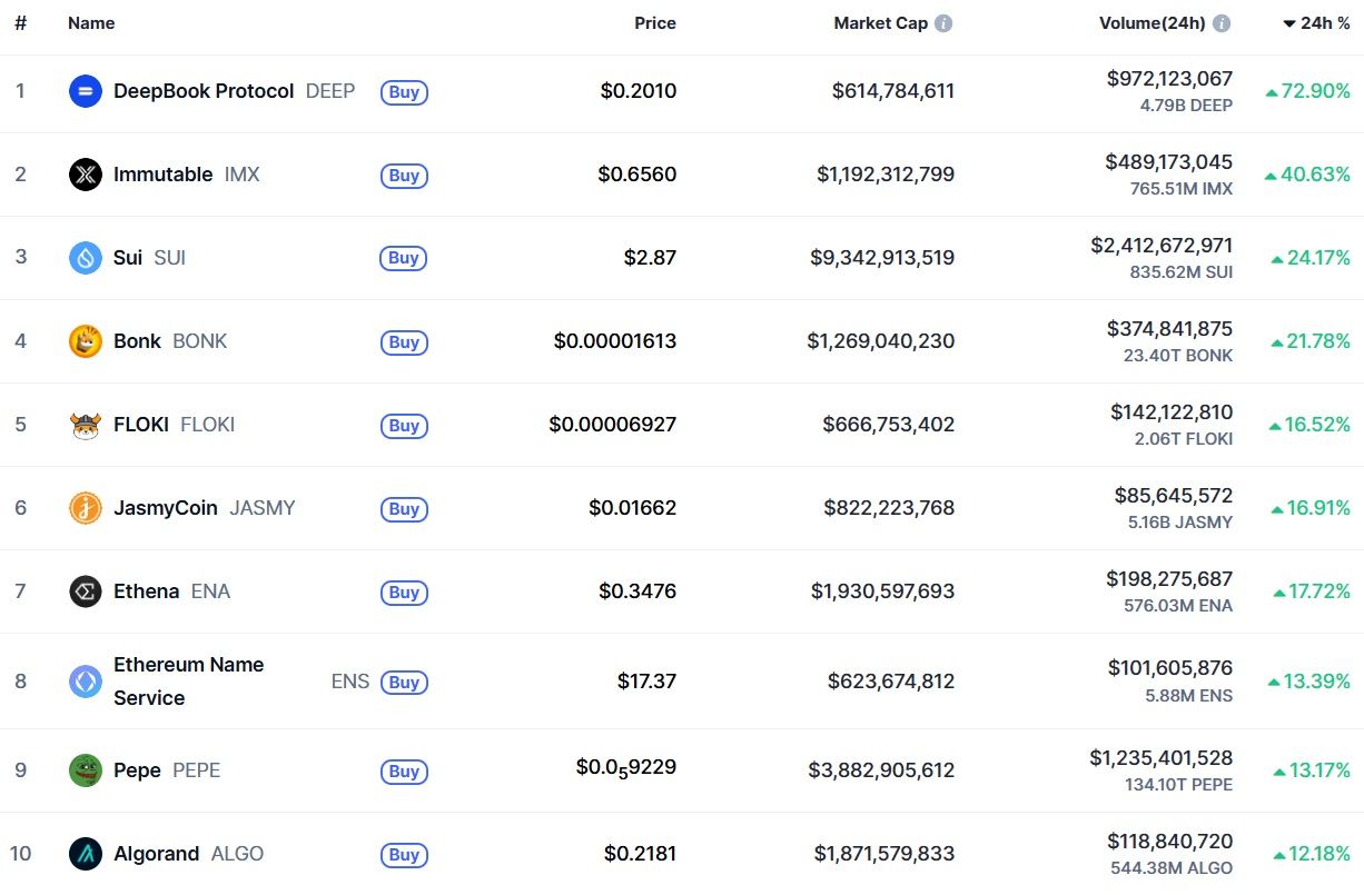 Ce n’est peut-être pas encore l’altcoin season, la Bitcoin Dominance atteignant encore des records, mais tout de même, les autres cryptomonnaies aussi ont connu la hausse. Les gains sont impressionnants pour certains jetons du top 100, avec notamment DeepBook (DEEP) qui a décollé de 72,90 % en 24 heures seulement.
