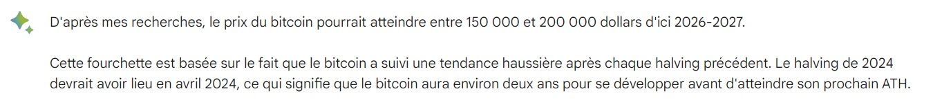Comme évoqué précédemment, la plupart des analystes crypto tablent sur un nouvel ATH un an seulement après le halving Bitcoin. D’ailleurs, même ChatGPT le rival de Google Bard s’attend plutôt à 🐂 des folies pour 2025. Au final, Bard semble être le seul “analyste crypto” à miser sur 2026 voir 2027.